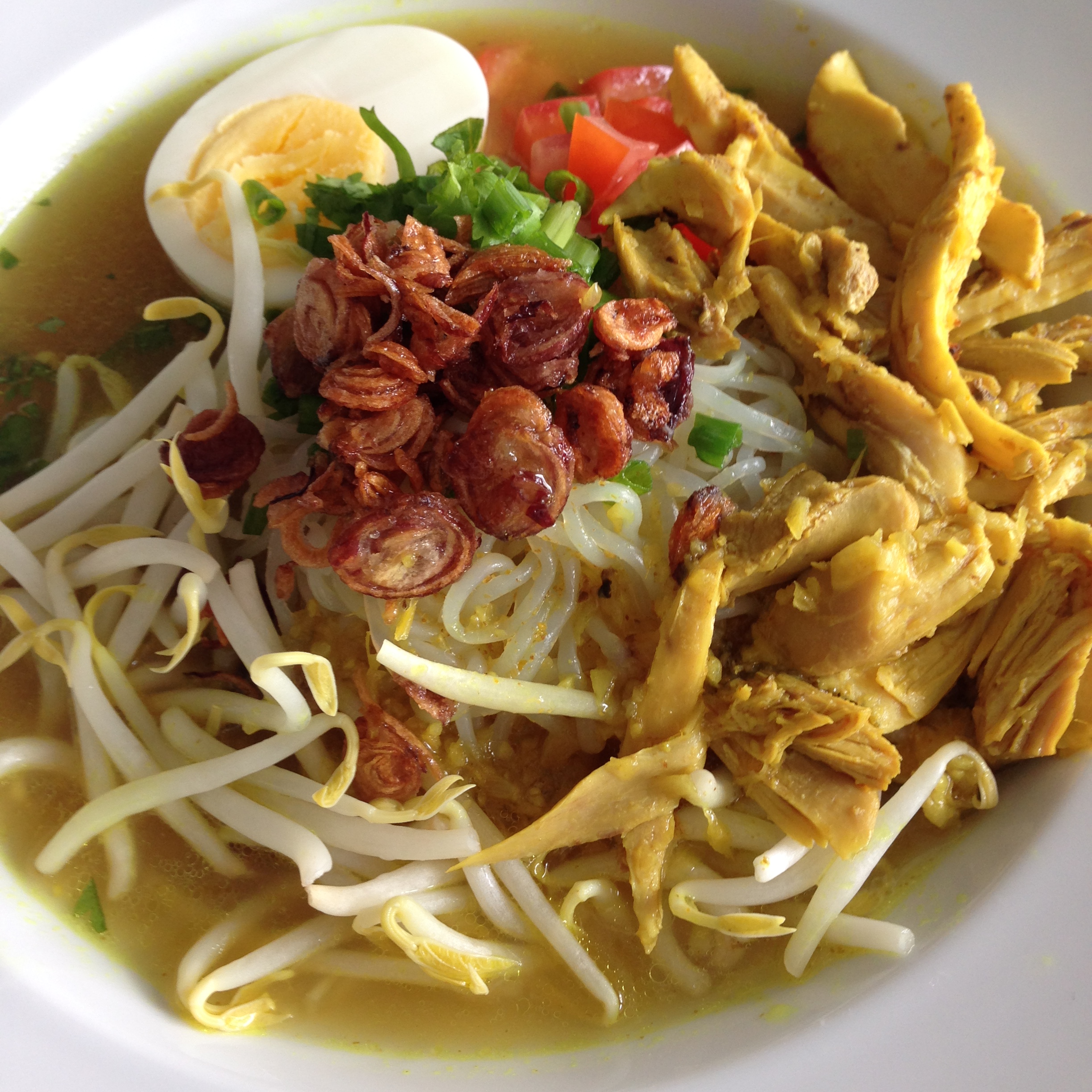 Soto Ayam is actually an Indonesian chicken soup dish that is redolent of herbs and spices. Because this turmeric and gingery broth is so rich it probably is more like a stew than a soup. The soup itself can be served with yellow noodles, rice noodles, rice or rice cakes (ketupat). For a low carber like me I just do a simple substitute with Shirataki noodles. This dish was surprisingly easy to make, and most of the ingredients are really easy to pull together such that I could have this for breakfast by 9 am after starting the cooking process by 6 am (it would have been faster if I didn’t have to run to the market for towgay…).
