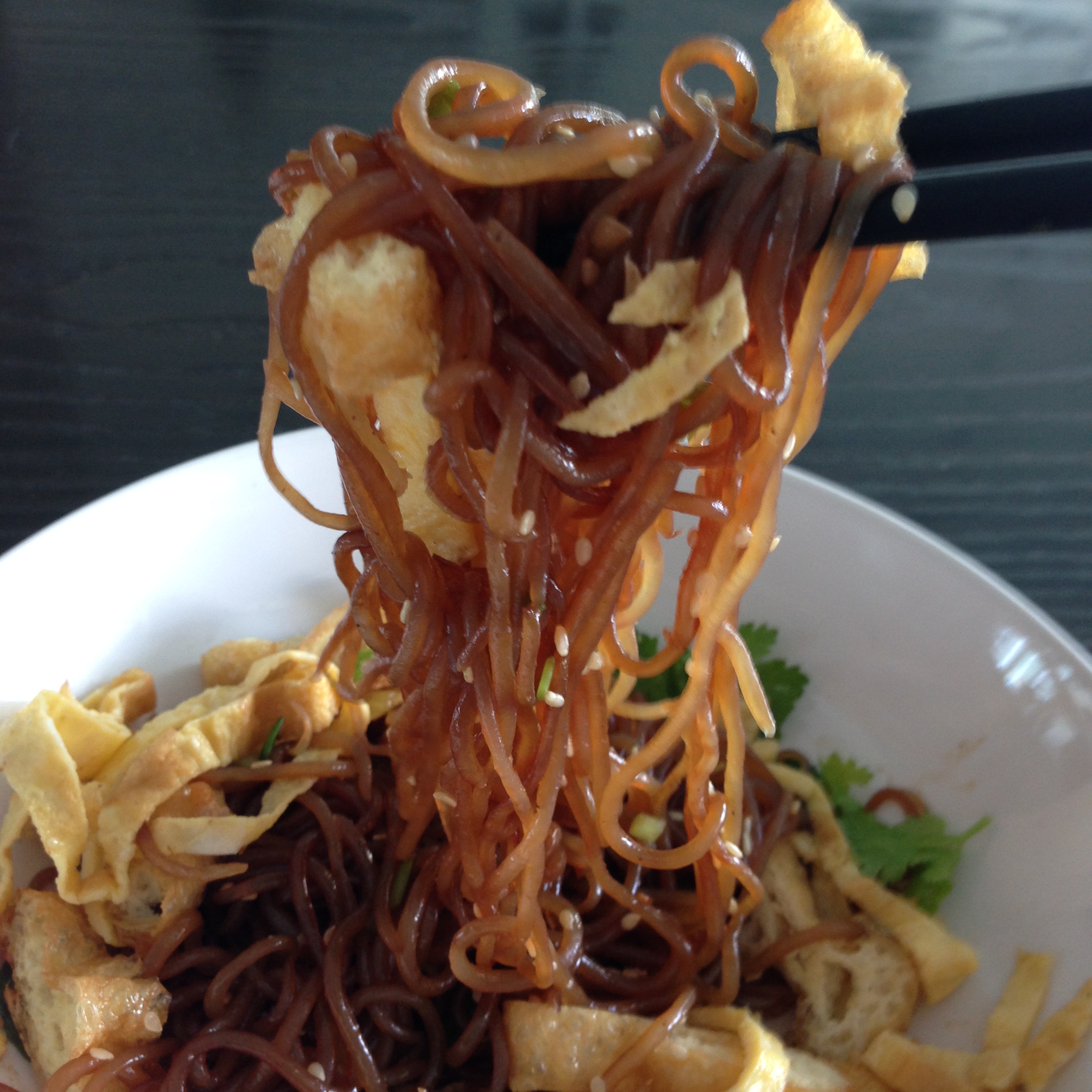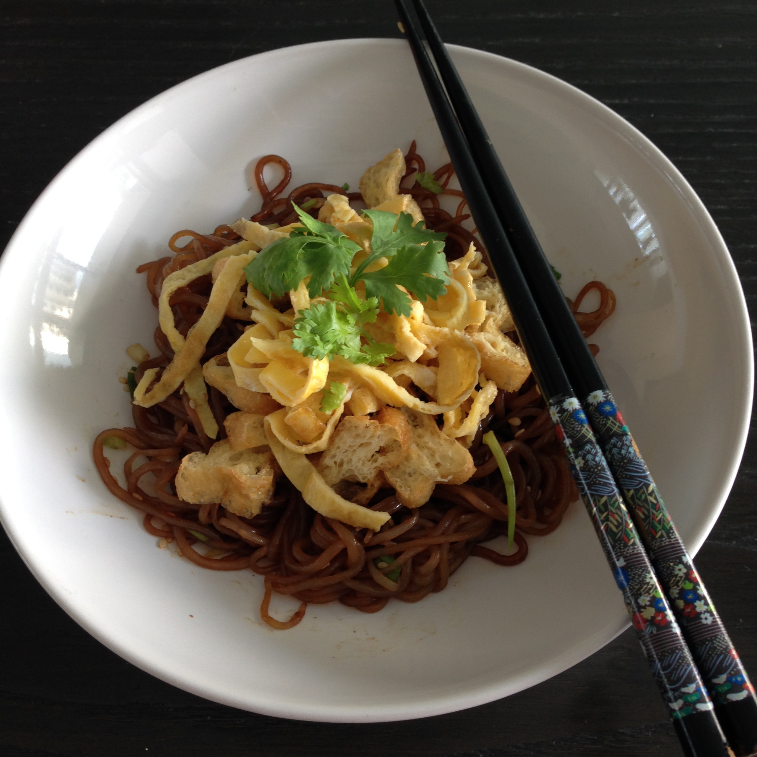 The use of dark soy sauce in this recipe renders a dark colour to the otherwise transparent noodles and gives it a richer and more assertive flavour.
