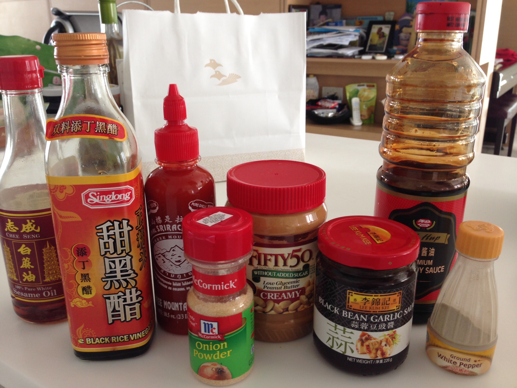 From left: sesame oil, black rice vinegar, sriracha sauce, onion powder, peanut butter, black bean garlic sauce, dark soy sauce and ground white pepper.