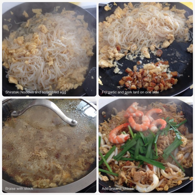 6. Heat 2 tbsp oil to a wok or large saucepan and add the beaten egg. Scramble the egg till almost cooked, then add the shirataki noodles and bean sprouts. Add 2 ladles of prawn stock and fry for another minute or so till noodles are relatively dry.