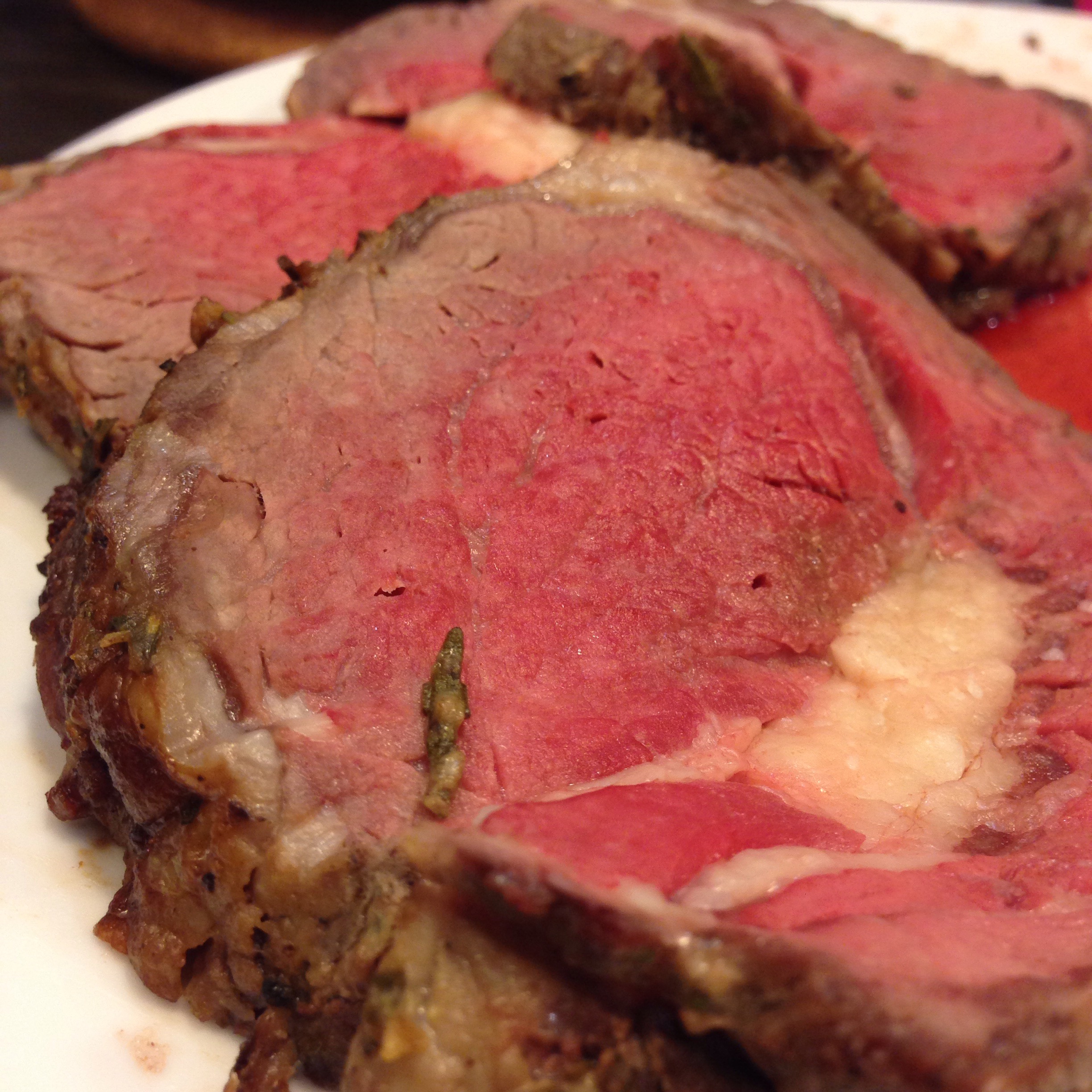 3. Preheat oven to 225 deg C, roast meat rib side down in a roasting pan for 15 minutes, then bring temperature down to 160 deg C. Continue roasting for approximately 1 1/2 – 2 hours. Check temperature of roast with meat thermometer – the roast should be about 60 deg C for medium rare center.