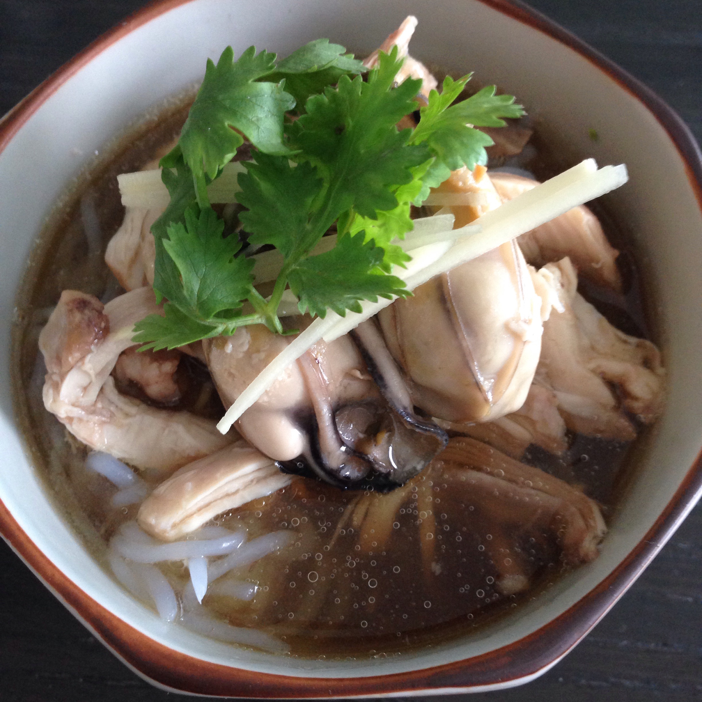 - Place each portion of noodles into a soup bowl. Top each bowl with shredded chicken, 3 oysters and soup stock.