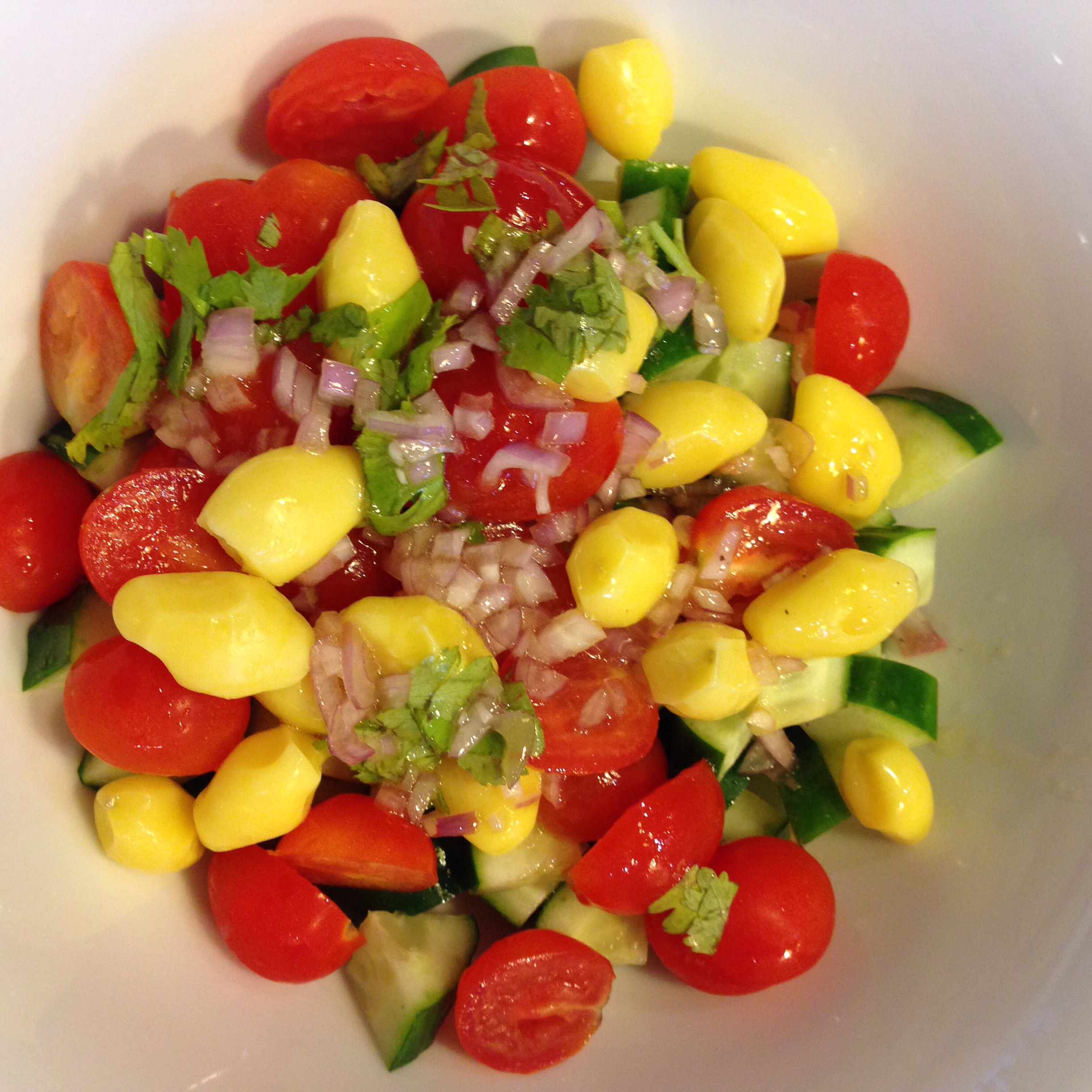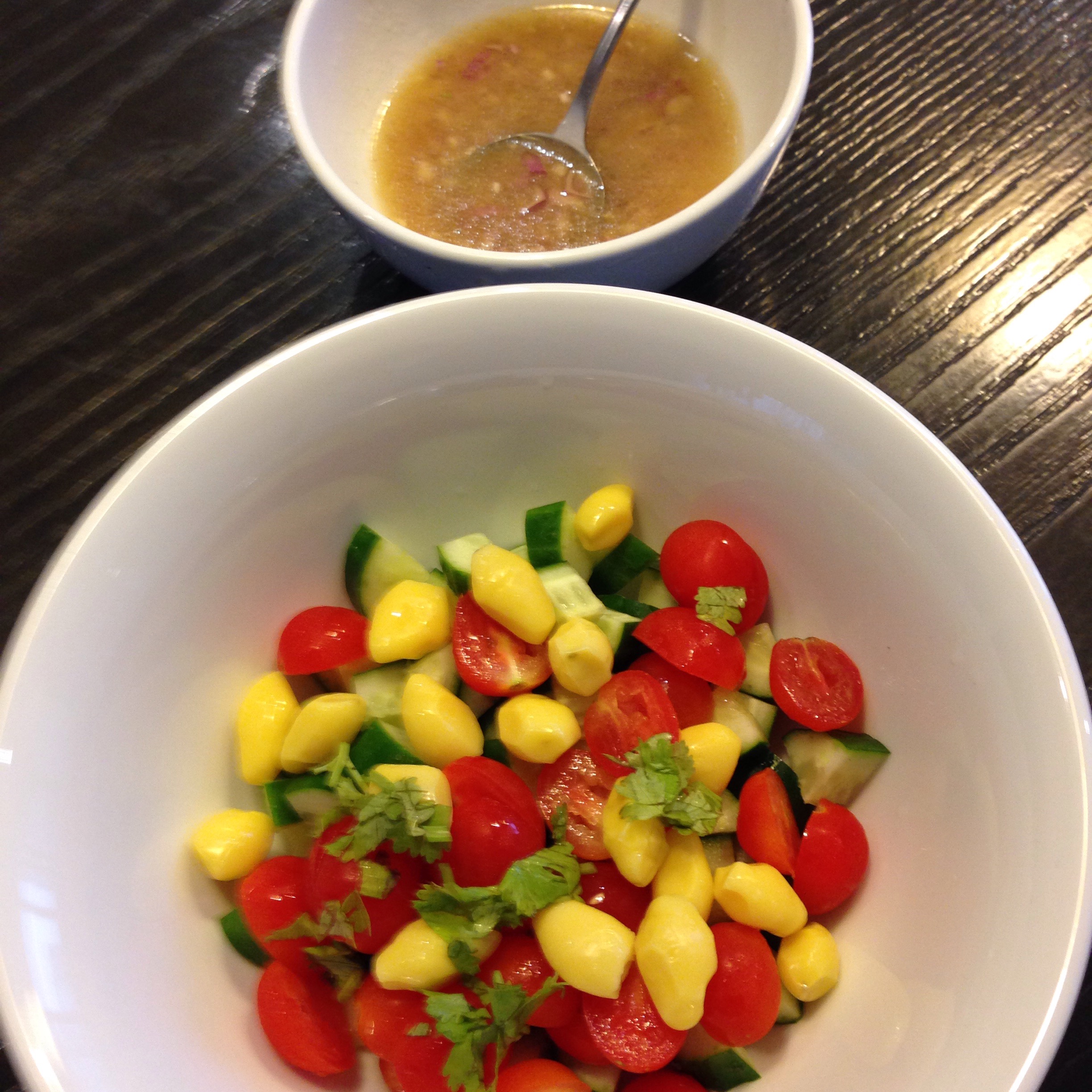 - Place the cut tomatoes, cucumber and gingko nut seeds into a bowl. Scatter the coriander leaves on top.