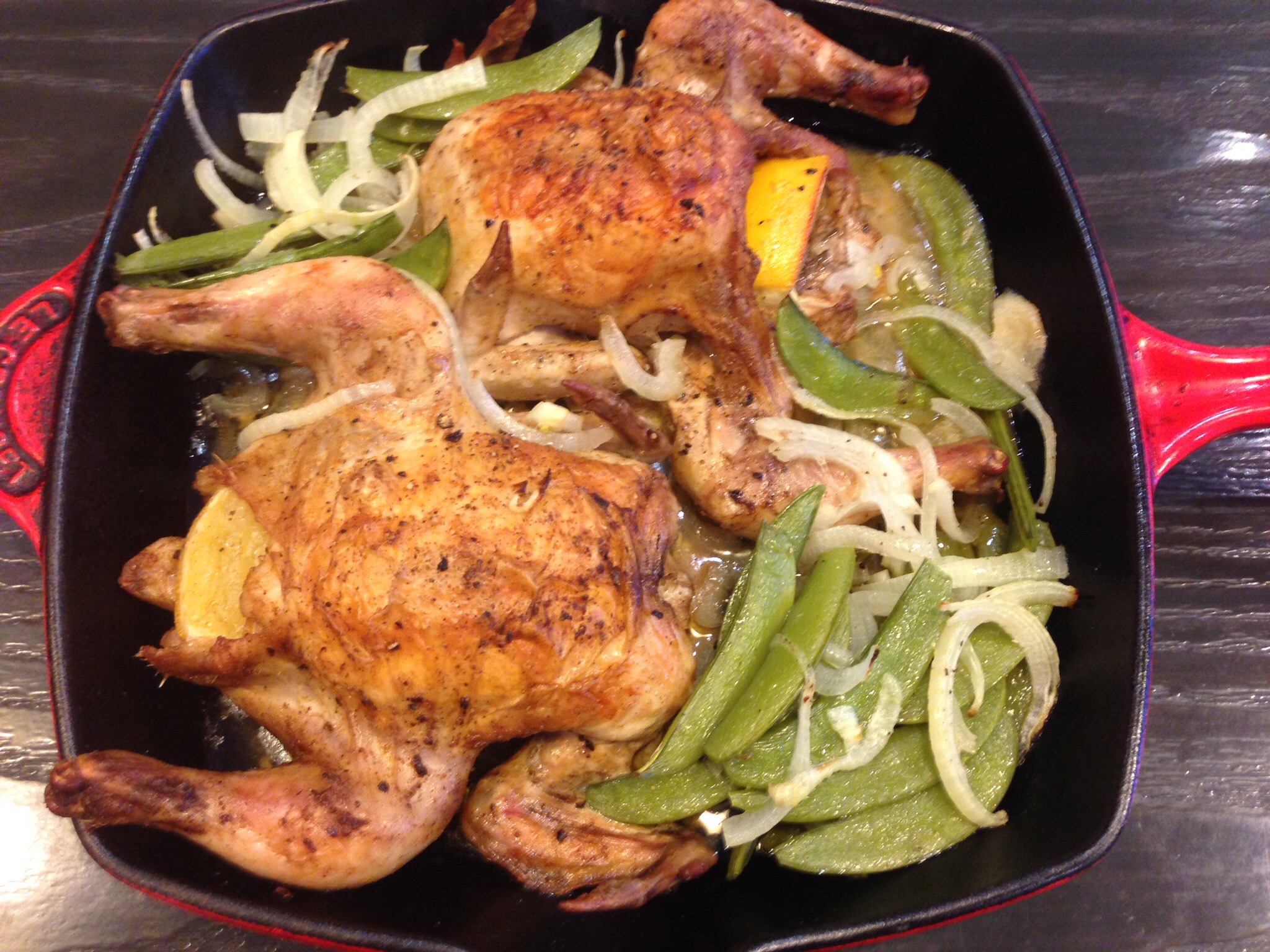 - Remove from oven and serve hot in the skillet. Slice the Cornish hens in half and serve each person with 1/2 the Cornish hen and a side of snap peas and onions.
