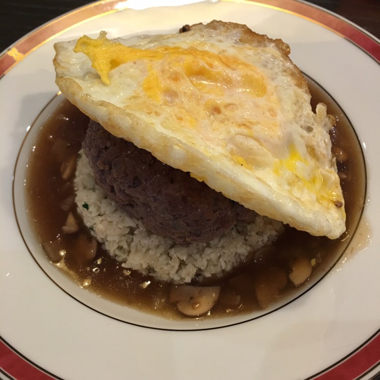Hawaiian food is a little strange – it’s an unrecognizable hodgepodge of Polynesian, American and Japanese cuisines. For some reason it seems to work surprisingly well. One of the oddities I came across in Hawaii was Loco Moco. The name suggests something a little crazy and truly this contemporary Hawaiian breakfast dish is an example of the odd marriage of Japanese and American food. Loco Moco is usually a hamburger patty and fried egg over a bed of Japanese sticky rice and doused with brown sauce.