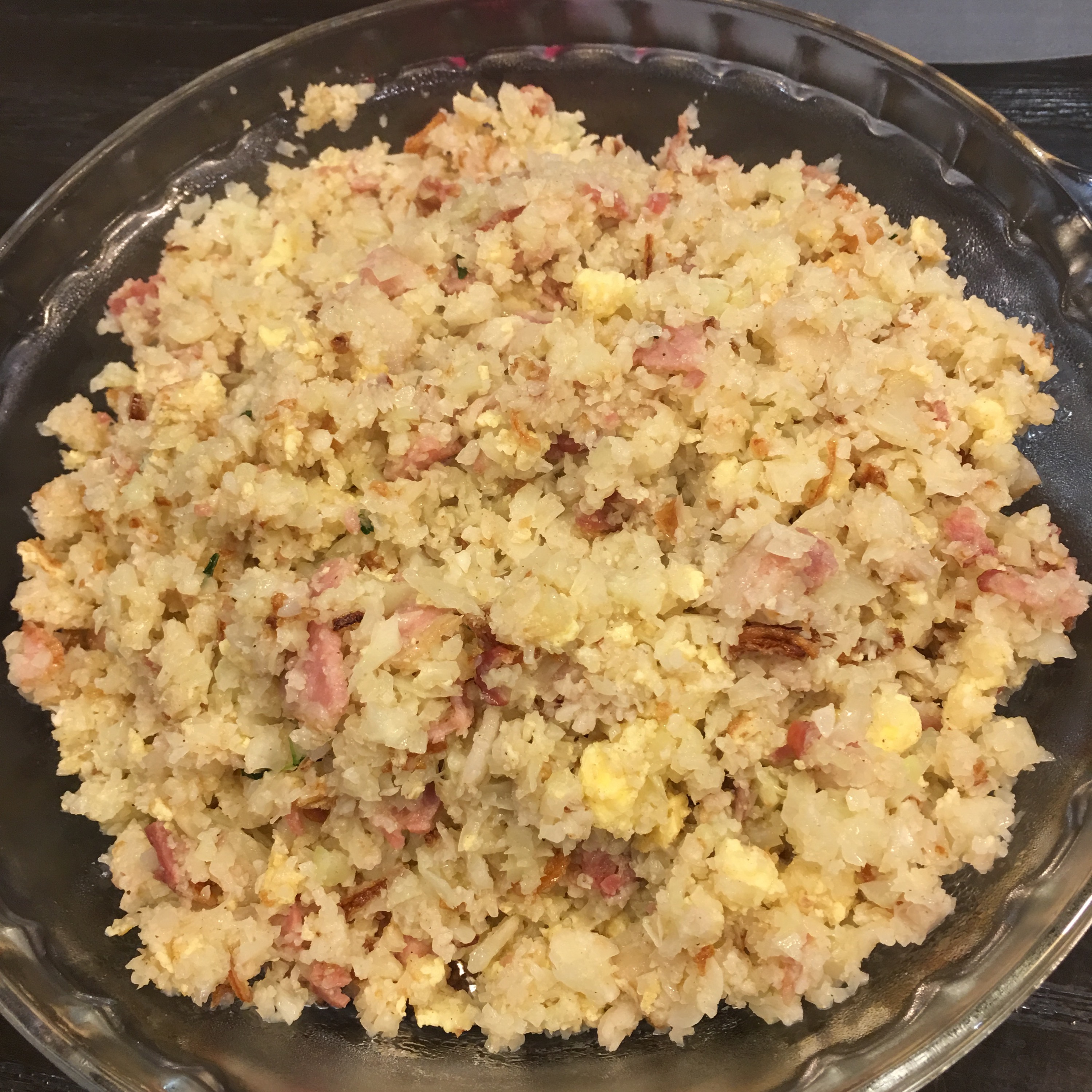 Making low carb rice is not so mind-boggling as you can imagine because cauliflower that you chopped up in a processor does have a kind of rice-grain appearance. I think the trick is to not over-fry the cauliflower as longer frying makes the cauliflower rice more soggy. So for this fried rice I also avoided liquid seasoning like soy sauce that can make the rice appear more wet. And the best way of masking the inevitable cauliflower flavor is to amp up the spices for the dish. So lots of garlic, some odd spices work. If I were not cooking for my veg-averse kid#2 I would also add in spring onions into this rather plain-looking rice.