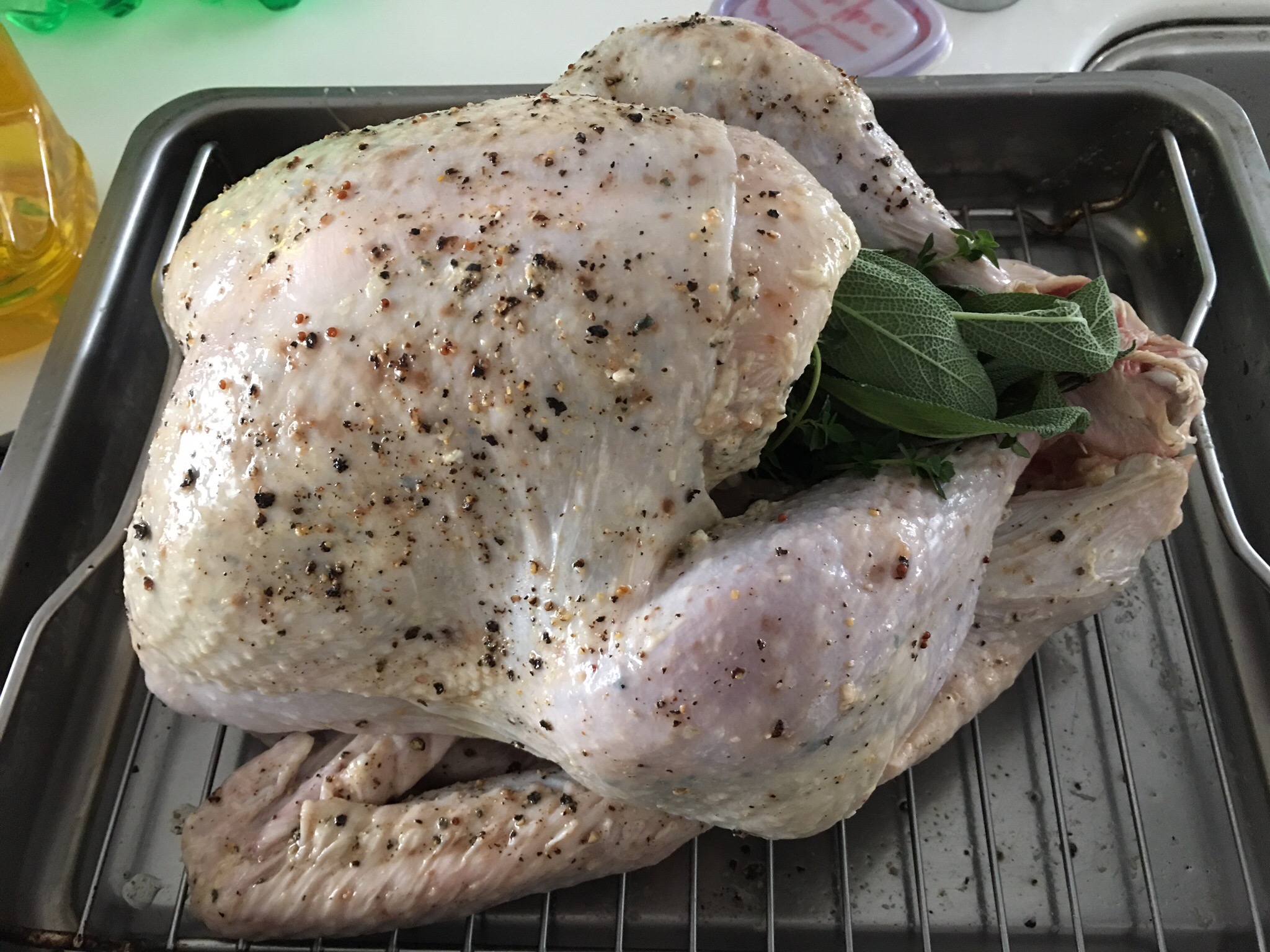 - Remove turkey from refrigerator. Drizzle the olive oil over the skin of the turkey.