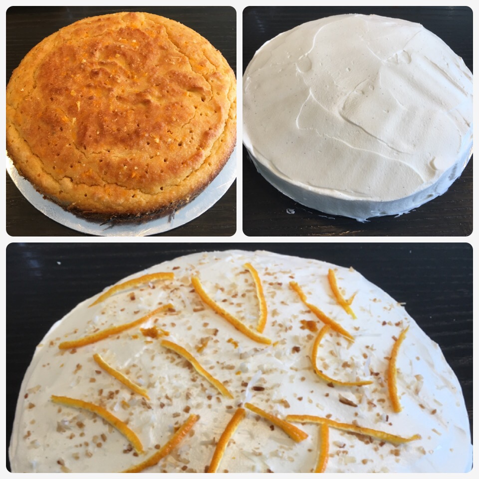 From the top left in clockwise direction: orange cake soaked with orange jello; cake with whipped cream icing; final result with toasted coconut flakes and sliced mandarin orange peel for decoration.