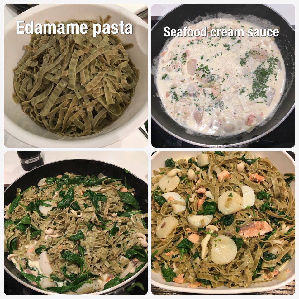 - Bring a large pot of water to the boil. Salt the water. When on a rolling boil, add the edamame pasta and cook according to specifications. When cooked, drain and set aside.