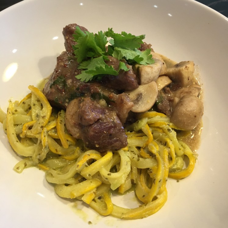 I think local food is a definite go to in my family, and eating western type dishes is considered a treat rather than the norm. In some ways cooking Western style dishes is much easier than Asian dishs which need a truckload of spices and a much longer prep time. After all it is not difficult to sear a steak or roast a leg of lamb. Kid#1 and kid#2 are beef fans (not surprisingly because dear hubs loves his steak). Beef stroganoff is a wonderful one dish meal as it is usually awesome over egg noodles. Since I was cooking low carb however, I made some adjustments to the recipe to cut out the flour (xantham gum is a good thickener). For the noodles, I used the spiralizer to get zucchini noodles “zoodles” which actually was rather nice and fresh tasting when paired with the creamy stew.