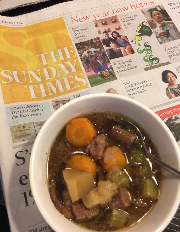 So a lot of my IP friends have been anticipating what I would make in my Pot the moment I got home…the answer is simple – soup of course! I think I went through a prolonged thaw since coming back the day before and caught a bit of a cold as well – the guy sitting next to me from the Doha to Singapore leg had a continuous hacking cough. So there’s nothing that beats a quick hearty beef soup for comfort. This recipe mimics something we had on Christmas Day in Kalabaka – the owners of our boutique hotel also ran a super popular taverna in town and the beef soup was amazing. It really hit the spot for a cold wintry Christmas Day and helped a tummy that was still a little queasy from motion sickness and windy roads.