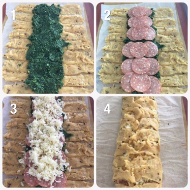 From top left: 1. Spinach layer, 2. Pepperoni Salami layer, 3. Mozzarella layer, 4. Stromboli weave