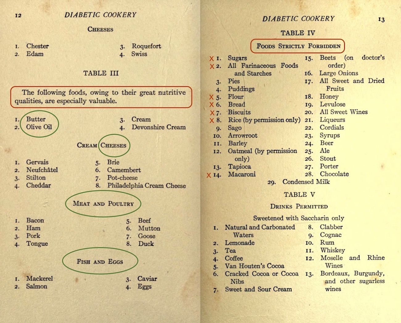 The irony is that prior to the advent of good insulin and blood sugar testing options, all patients just went low carb. It was the done deal. In 1917 Rebecca Oppenheimer published a diabetic cookbook that sensibly cut out flour, pasta, rice, bread and sugars and this old cookbook is more coherent than a lot of what is on our shelves today.