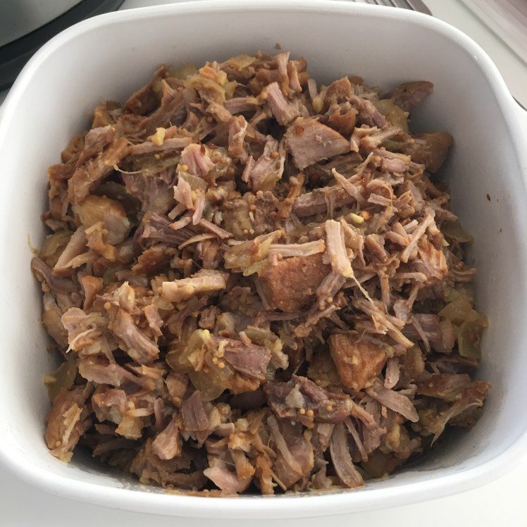 - When done, do a quick pressure release. Take out the pork cubes and place in a casserole or bowl and shred the meat with 2 forks. In the meantime, put the pot back on sauté mode and reduce the remaining gravy for about 15 minutes.