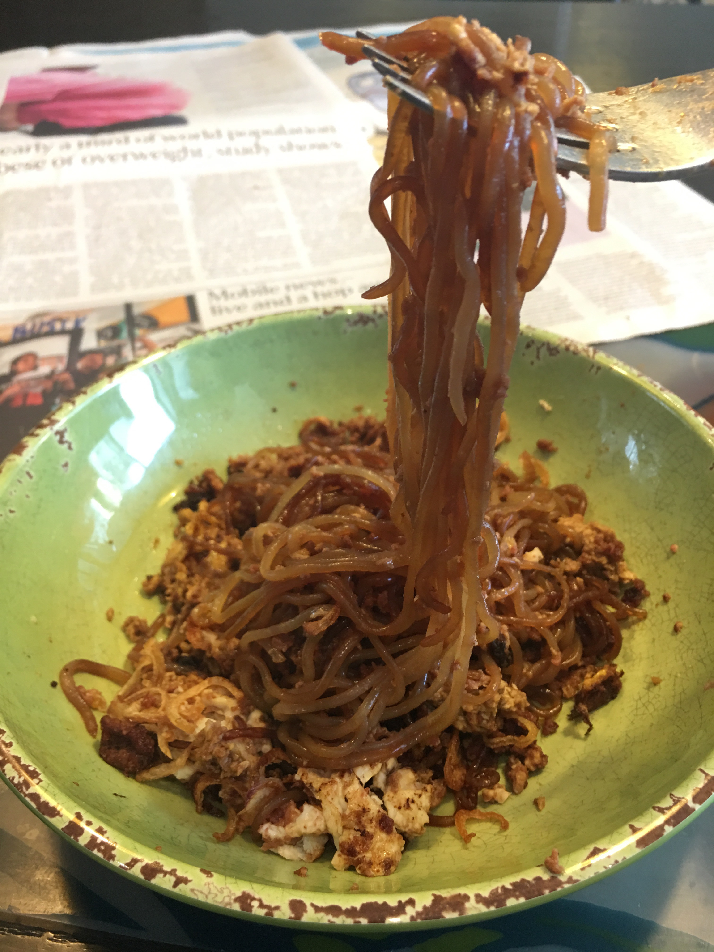 Anyway after a couple of days of basal testing and extended fasting I was so pleased to be able to have a sit down breakfast. I had a kind of craving for noodles and I had a solitary packet of shirataki noodles in the fridge. This was a seriously fast prep – I think it took no more than 10 minutes to get the noodles to the table. Shirataki noodles are like an empty canvas waiting to be coloured. I threw on both dark and light soy sauce as well as corned beef, and the saltiness was soaked up by the completely flavourless noodles. If I were cooking for company I would have chopped up some vegetables to add to the texture of the dish but this was just a single one-person portion that was for a quick meal.  It did not look glanourous or gourmet, but it sure hit the right spot!