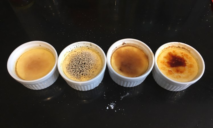 So the powdered Swerve actually didn’t really brown very much with the blowtorch. It turned a delicate sheen of beige after a while and made a little thin crust. The flavour was quite nice but with the usual cooling taste on the tongue. The Splenda behaved frighteningly with the high heat of the blow torch, turning into little intense black dots almost instantaneously. I must have broken down some chemical bonds there. Monkfruit was lovely, with a nice caramelization and solidifying with cooking into a nice crust. And the sugar one of course was my control ramekin – as seen in the picture below.