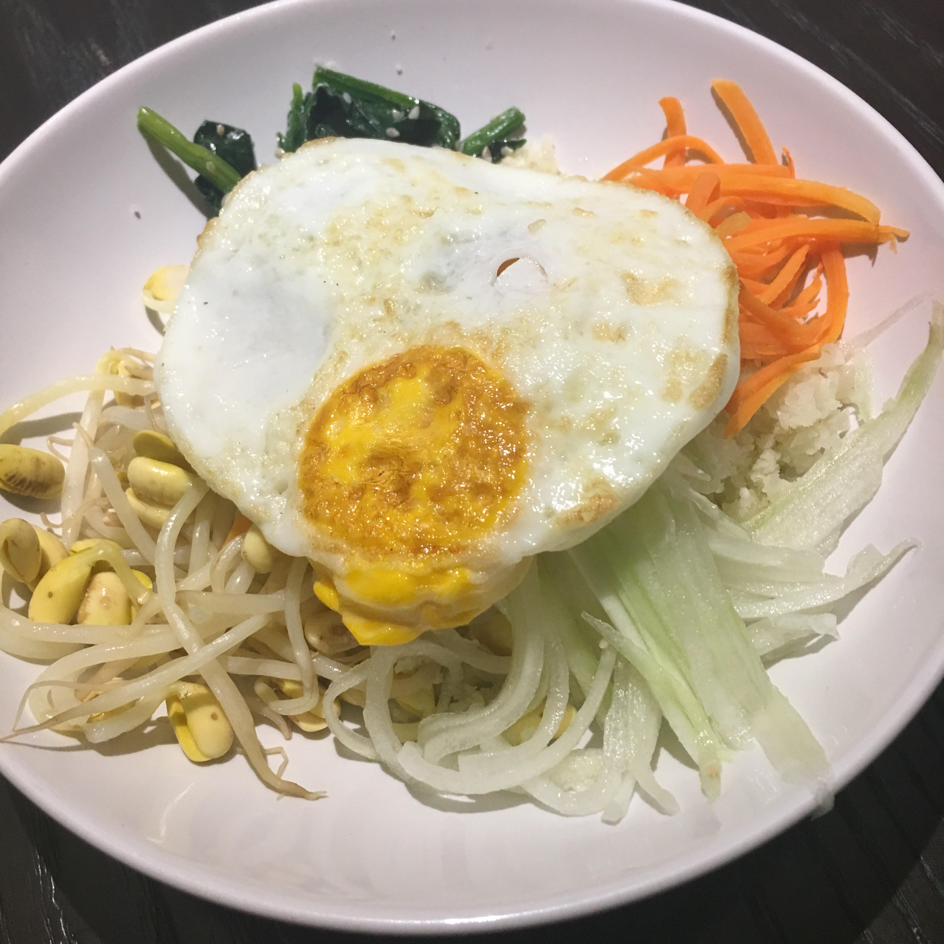 - Finally the assembly! Put a serving of cauliflower rice into a bowl. Neatly top the cauliflower rice with soy bean sprouts, spinach, carrots, cucumber and finally the fried egg on top. Serve with kimchi and gochujang on the side. Gochujang is not low carb so if doing low carb either omit it or take very little of it.