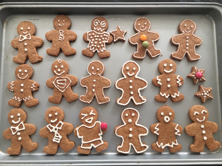I also had a crateload of fun yesterday making gingerbread men. I admit these weren’t quite the chewy gingerbread men I used to make but these still definitely had a Christmassy flavour and held up well to handling and icing. As you can see I got a little bored after a while and the little men got more and more manic-looking as time went on.