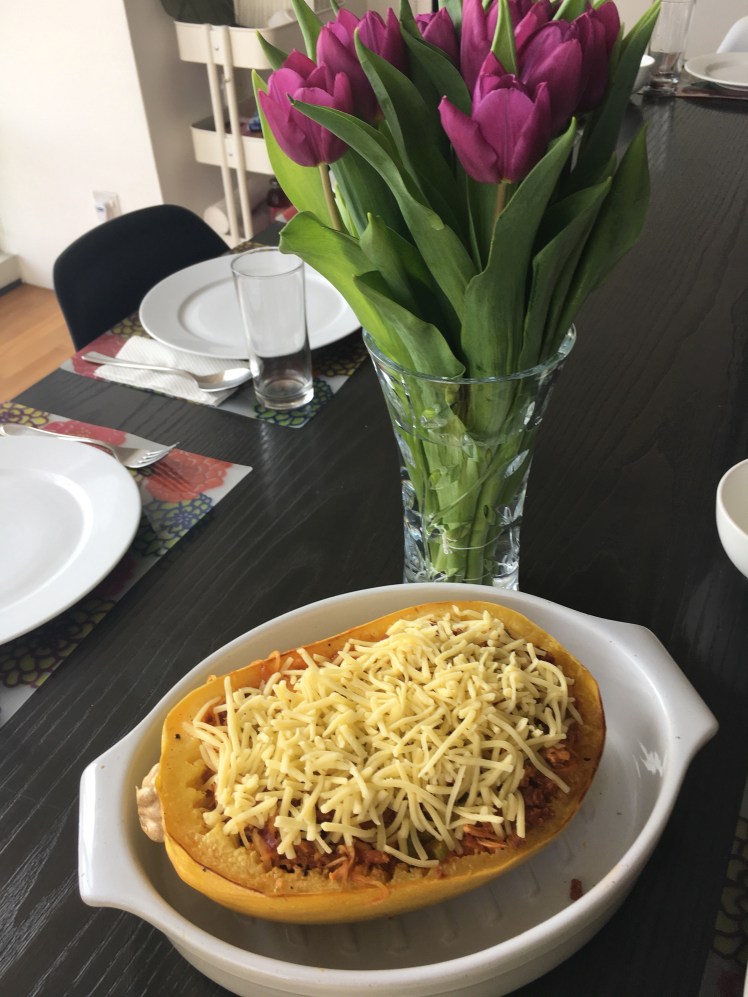 Back home in Singapore it was fun figuring out what to do with it – in the end I decided to bake it as usual, but to make a dish within a dish – baked chorizo, chicken and spaghetti squash shreds in a half squash. It ended up being a half squash because it was really large and already filled my largest baking casserole.