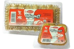 - Carefully cut a slit on one side of the tofu puff and open up the pocket. Fill each tofu puff with the meat filling and place it on a casserole dish with the cut side up.