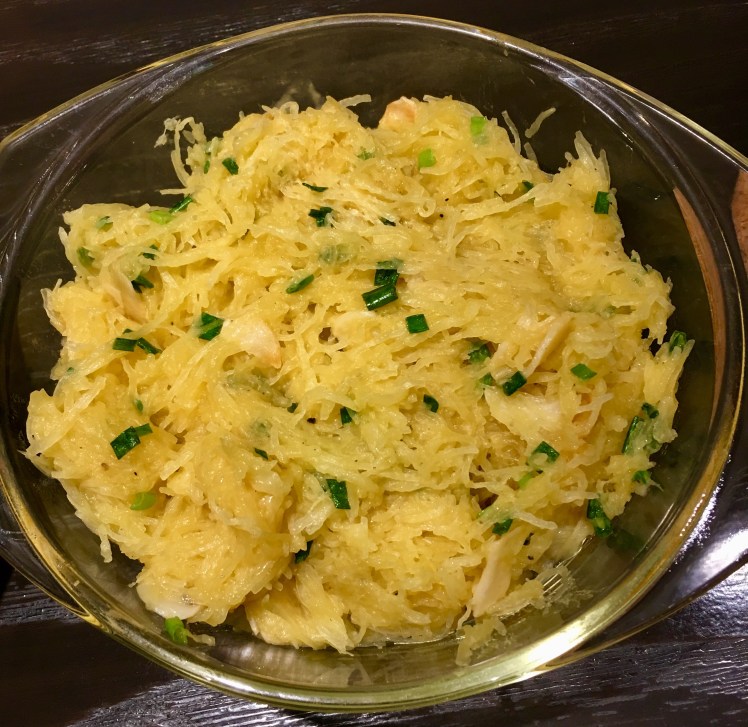 Sad to say the spaghetti squash season has come to an end and this was the last squash I had that I had half forgotten at the back of the fridge. I decided to go for a really simple recipe that harnesses the richness of garlic and Parmesan cheese and the crunchy texture of the strands of squash. I swear this was the best way to treat the spaghetti squash – it highlighted the natural tastiness of the squash.