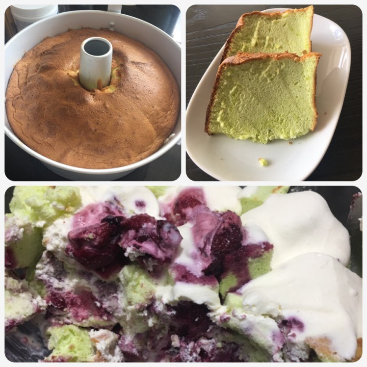 Yesterday was a series of kitchen disasters. I set out to experiment to make a low carb Pandan chiffon cake and ended up completely annoyed. Firstly I used an open bottle of meringue powder, not suspecting that it had gone bad…and the whole cake looked beautiful but tasted sour! It was awful and I threw that away. Then I trotted out to buy more eggs and tried the recipe again with some tweaks (I was trying to use Maria Emmerich’s low carb angelfood cake as a base recipe) and it turned out bad again! This time I think it lacked the luscious silkiness of a chiffon cake and the taste wasn’t quite right. However, I didn’t throw out this second cake, but after moodily grumping around half the day, decided to turn the failed cake into a trifle.