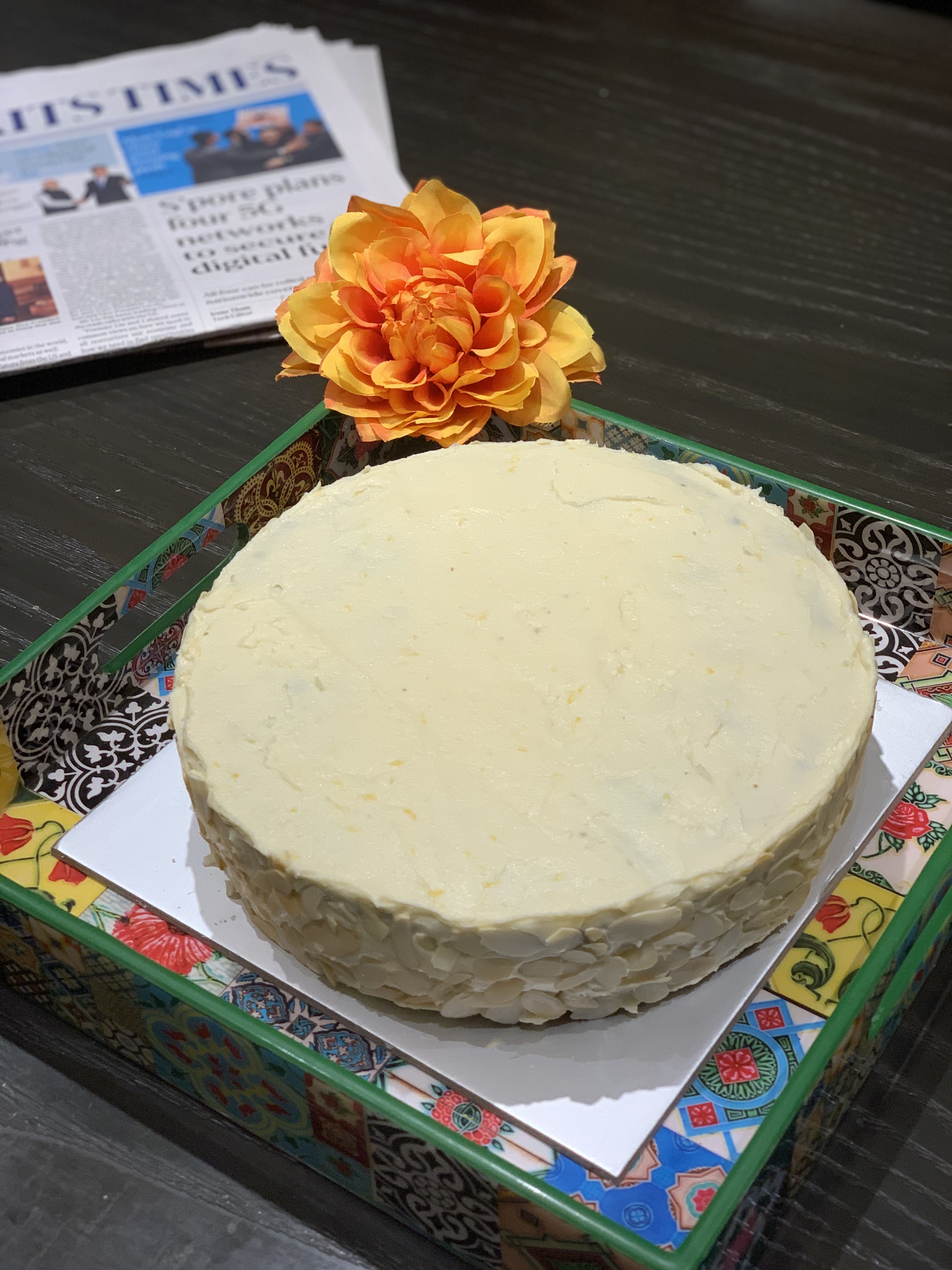 - Place the other cake on top, then frost the sides and top of the whole cake. Carefully place the almond slices over the sides of the cake.