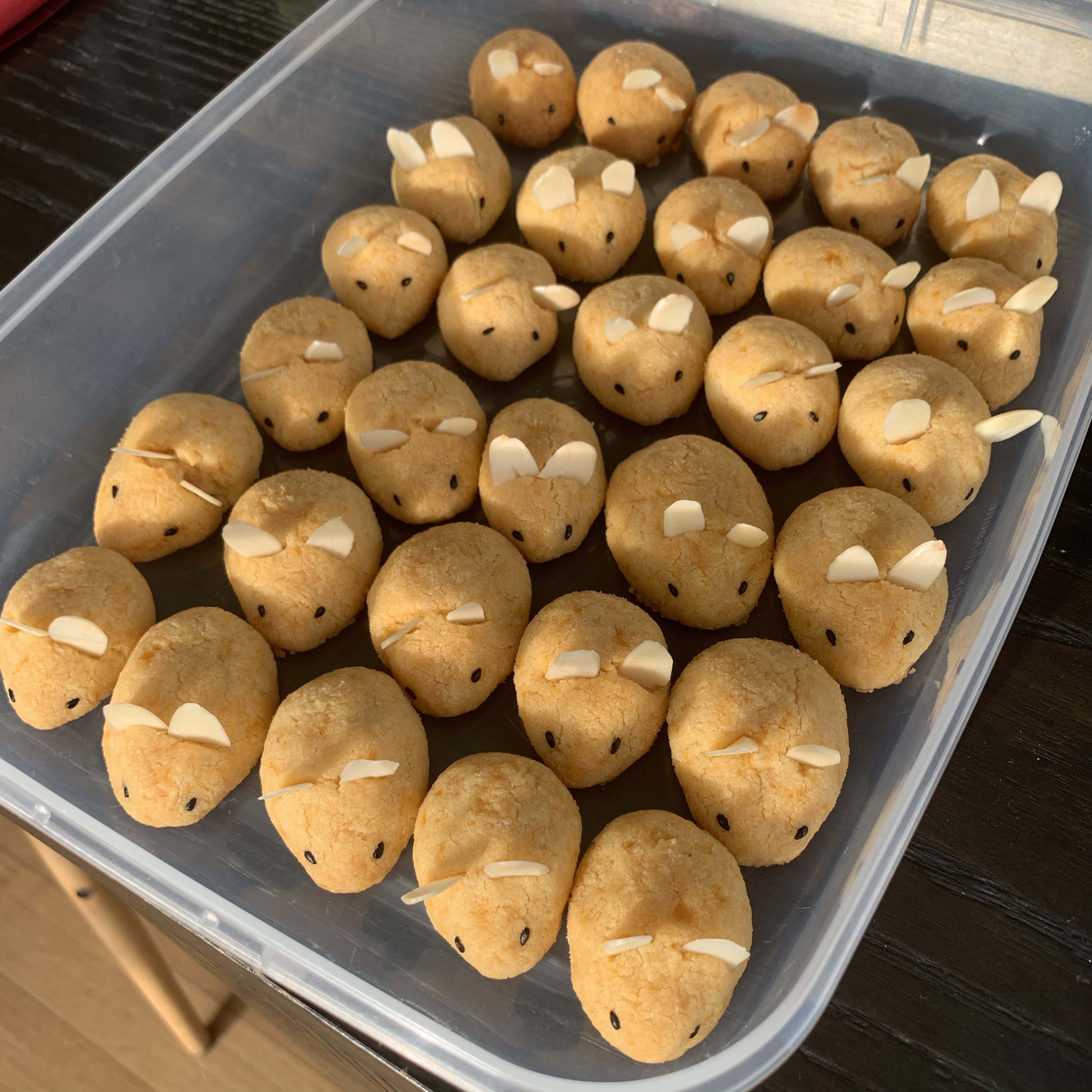 - Place 2 black sesame seeds on either side of the sharp end of the dough ball for the rat eyes and stick 2 almond flakes in for the eyes.