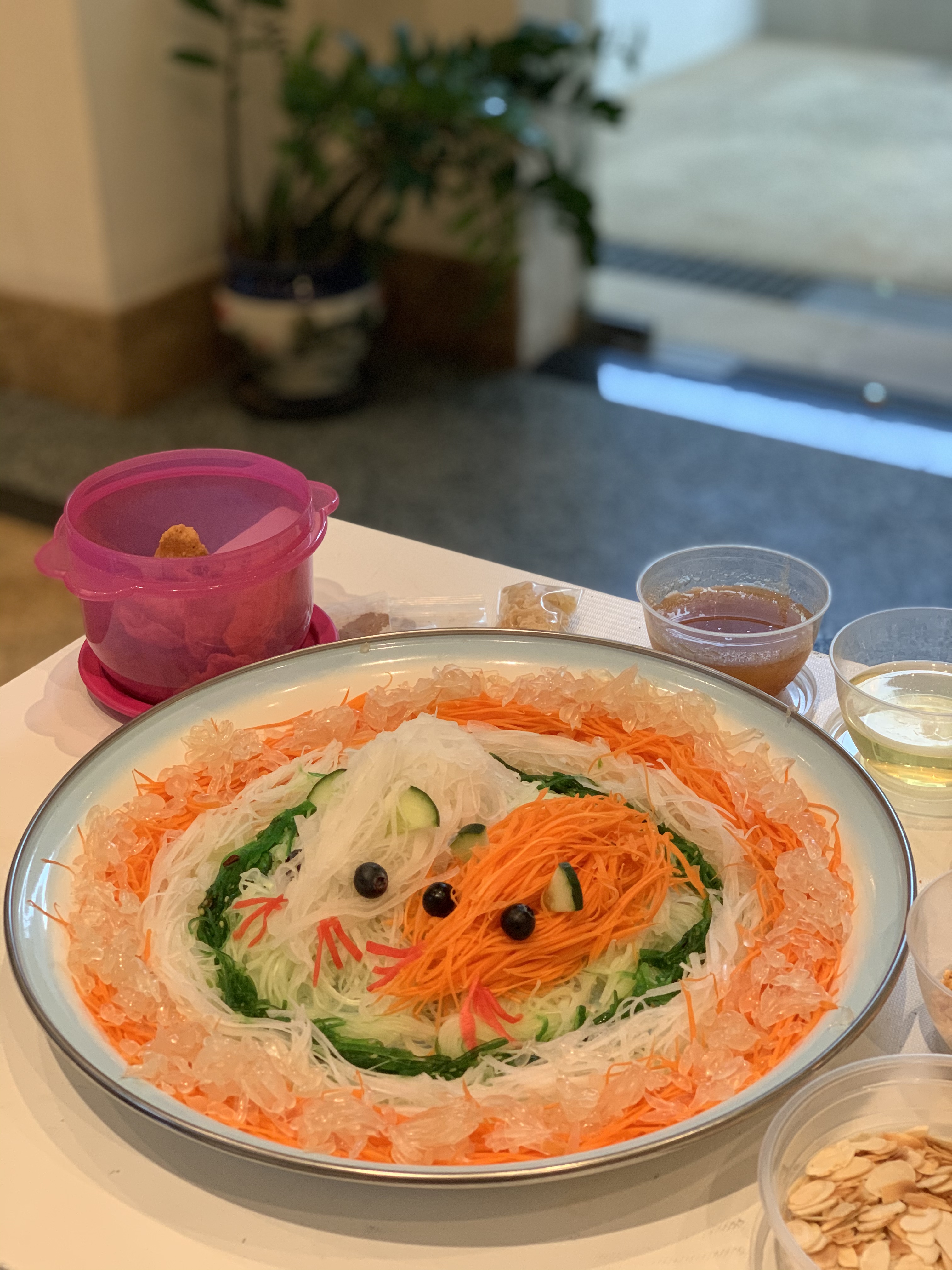 – I usually get sashimi grade fish for this. The homonym 余 means ”surplus/extra” and sounds like “鱼” which is the fish that is tossed in. I often add fish skin crackers for added crunch here (there was a season when no one put raw fish in this salad because of a couple of fatal food poisoning cases).