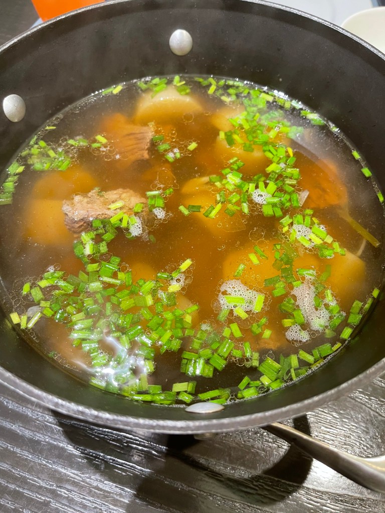 - Carefully remove the daikon, beef short ribs and place into a soup pot. Drain the soup into the pot and discard the onions, ginger and spring onion bits. 5.Skim off the oil from the top of the soup. Bring the soup to a boil and add the green part of the spring onions. Add the shirataki noodles if using. Serve hot.