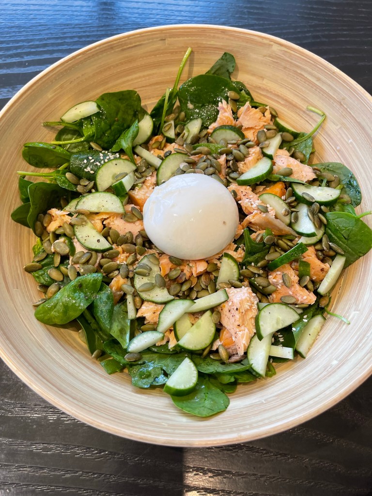 - Toss the remaining salad dressing with the spinach and cucumber. Plut the salad in a large salad bowl. Scatther the salmon chunks on top and sprinkle the toasted pumpkin seeds over it all. Place the burrata cheese right in the center of the salad and serve.