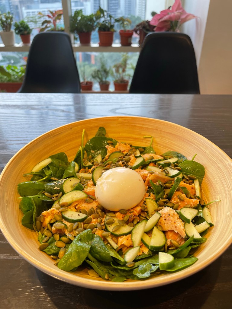 So here’s the salmon salad recipe – if you are making this feel free to switch the salad greens and the pumpkin seeds to any other nut topping.