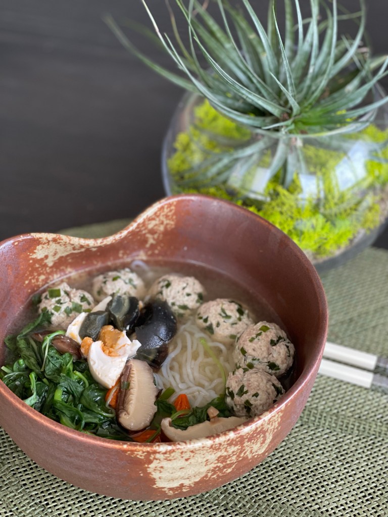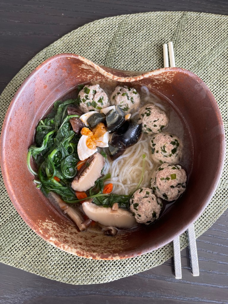- Place the shirataki noodles and a few teaspoons of century egg and salted egg into each bowl and top with a few meatballs, spinach and soup broth. Serve hot.