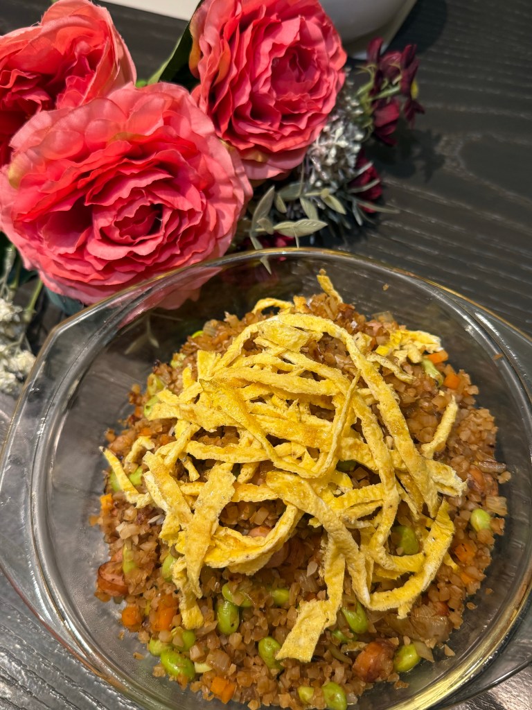 - When the cauliflower rice is cooked, turn off the heat and mix in the thinly sliced omelette, reserving about 1/3 to top the cauliflower rice before serving.